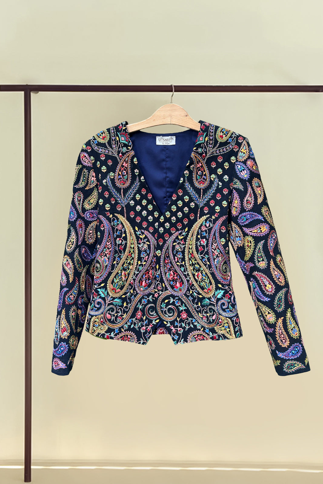 Step into the world of Gul Ambika, a masterfully handcrafted denim jacket that fuses modern fabric with timeless embroidery artistry. Made from premium denim, this piece showcases the challenge and skill of creating intricate Resham embroidery on denim, resulting in a jacket that is both unique and luxurious.