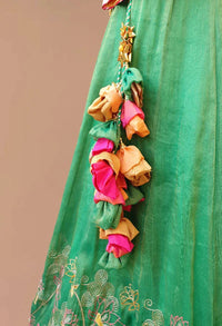 A play of color and craft, Raangsheen draws from the traditional Pichwai art form and translates it into a luminous lehenga. The palette of saffron green and peach-pink is accentuated by resham and zari embroidery, detailed gota work, and artistic tassels. For the dreamer who dresses in stories.