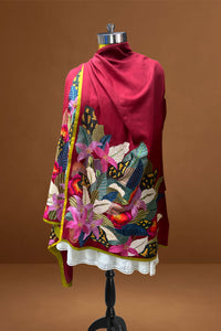 A dramatic interplay of colours, textures, and emotion—Atrangi is a collector’s dream. Handwoven from the finest pashmina and adorned with multicolour resham stitches and delicate pearl detailing, it turns every fold into a canvas of bold expression.