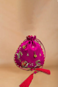 A celebration of femininity and grace, this potali is handcrafted from pure silk in a romantic shade of pink. Adorned with intricate zardozi and resham embroidery, it exudes elegance. The finishing touch—delicate handmade resham tassels—adds a soft movement, making it ideal for festive evenings and wedding functions.