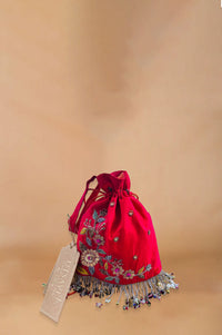 A must-have in any trousseau, the Laali Potali is a bright red silk pouch that carries the warmth of tradition. Embellished with gota, crystal beads, and delicate resham work, it's finished with a heavy dori tassel for a dramatic flair.