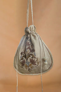 Understated yet exquisite, the Noor Potali features vintage zardozi bootis on a soft natural silk base. Finished with signature silk tassels, this design speaks of quiet luxury, preferred by those with refined taste.