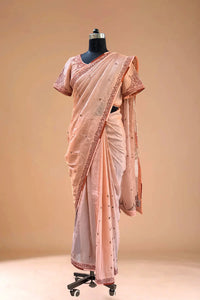 Whispers of Kashmir come alive in Gulresham, an exquisite saree adorned with fine resham embroidery, glass beads, and zardozi detailing.