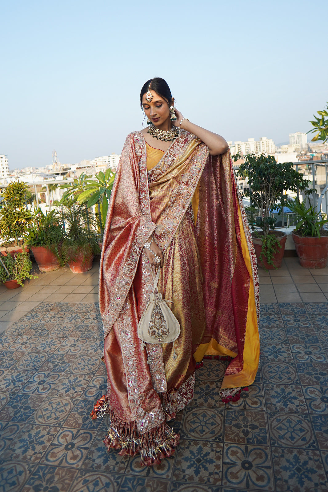 Mangal Safarnama is a tribute to timeless bridal grandeur. Crafted in rich Kanjivaram silk blended with resham and tissue textures, this saree embodies heritage with a poetic narrative woven into its design.