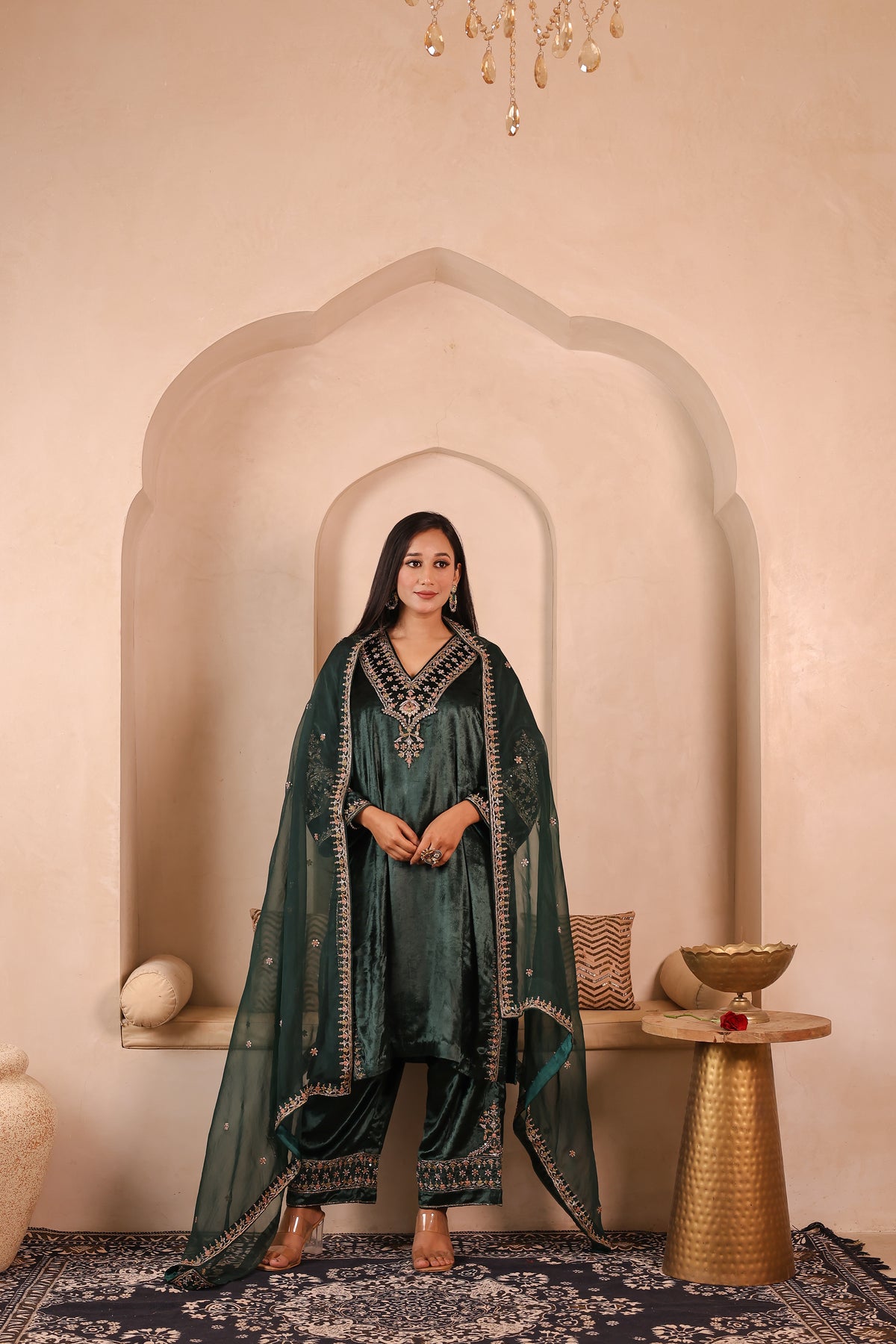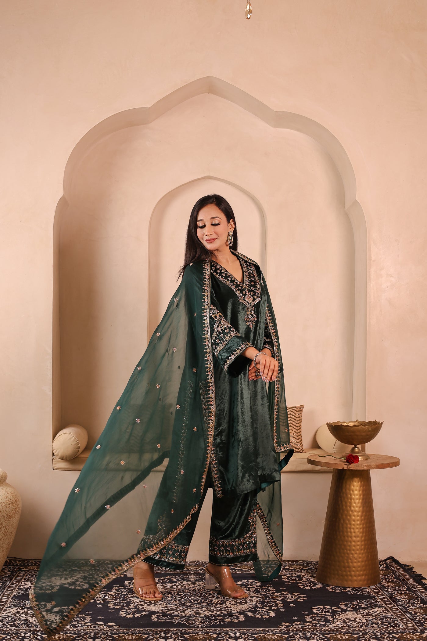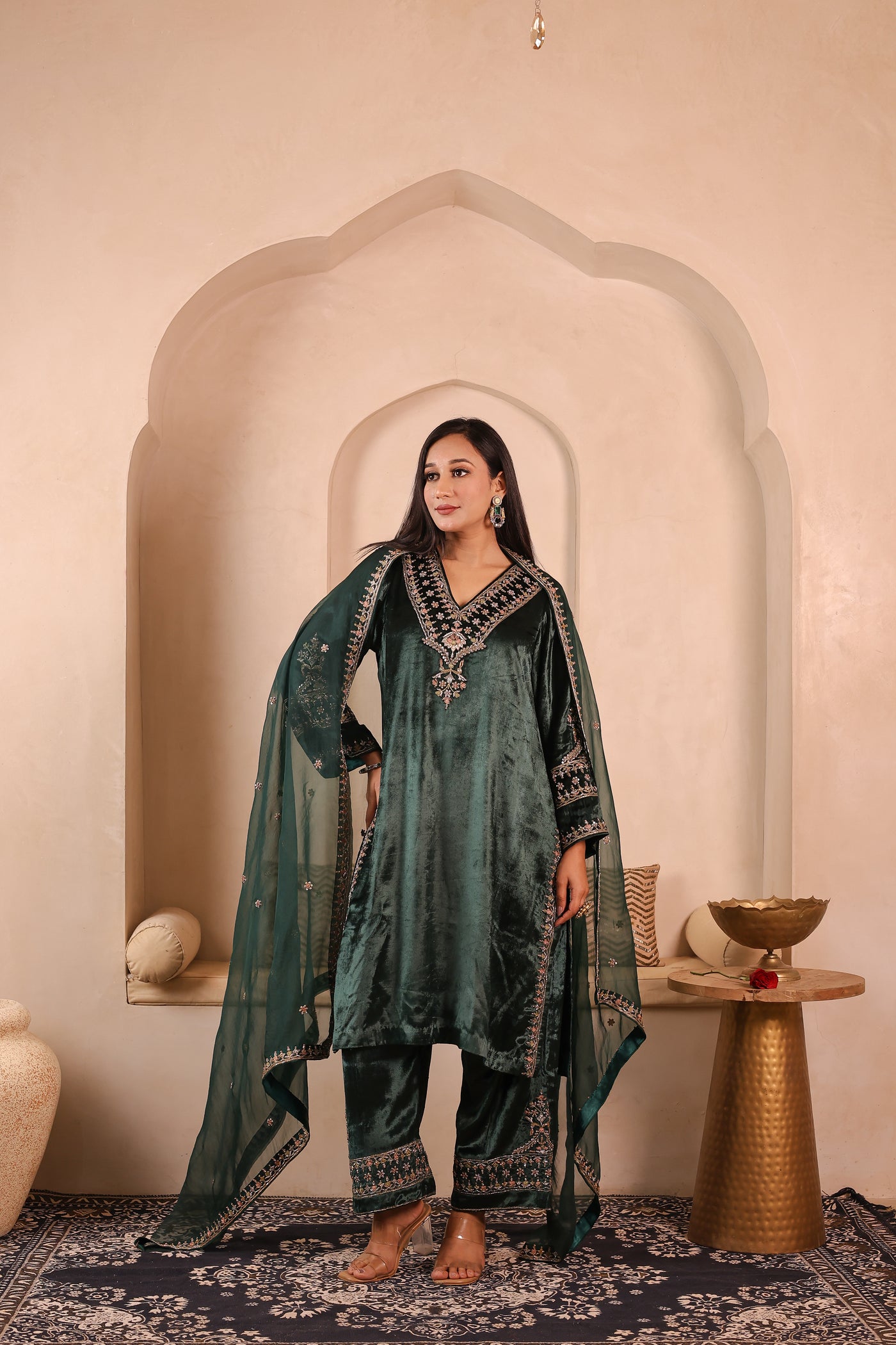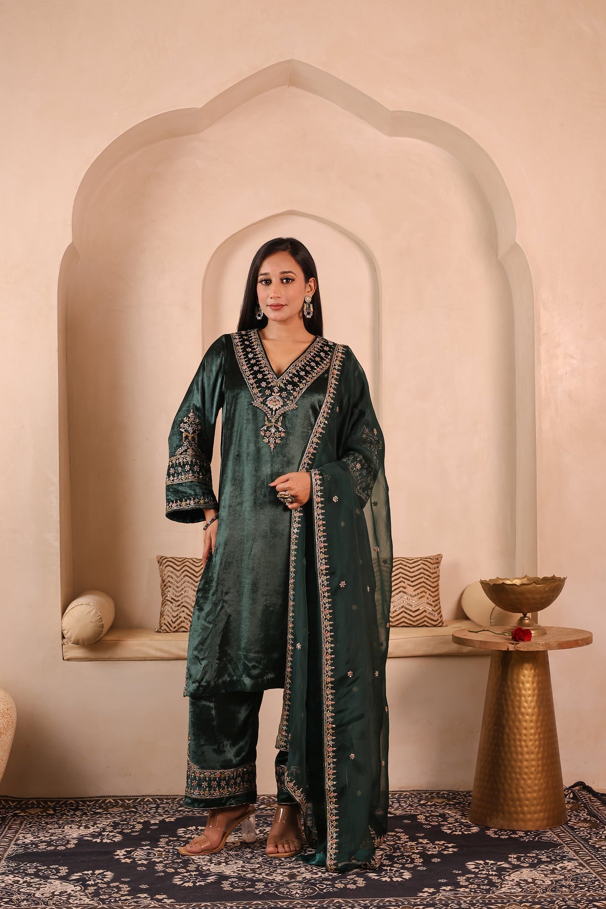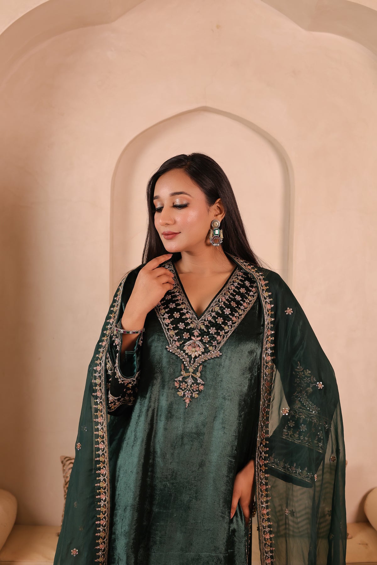 Gulzar Sabz is a handcrafted velvet suit set featuring a kurta paired with izzar palazzo and an organza dupatta. The outfit is detailed with elegant glass beads, dabka, resham, and sequins work, done completely by hand. The rich velvet fabric gives a premium and festive look, making it suitable for weddings, festive occasions, and special gatherings.