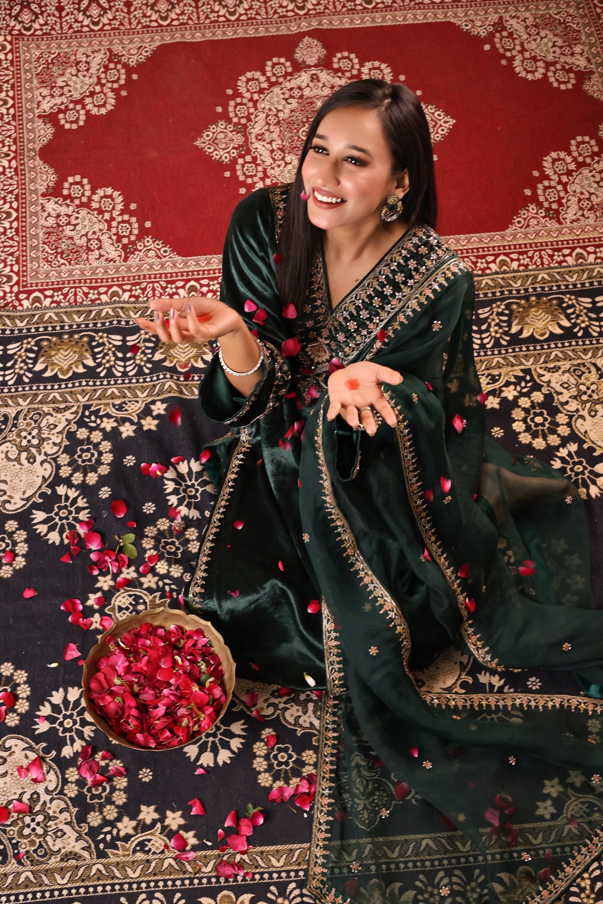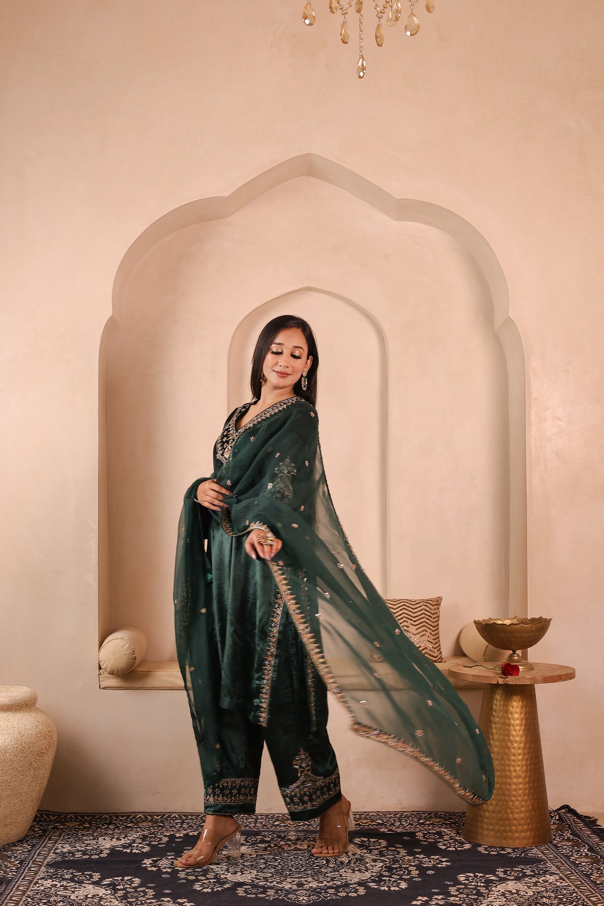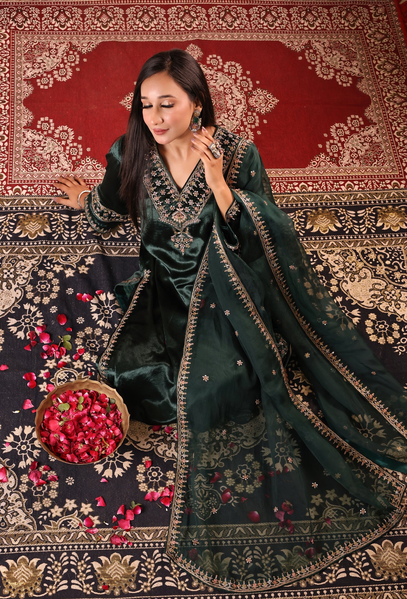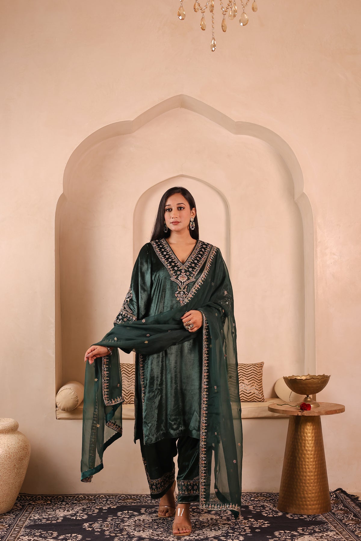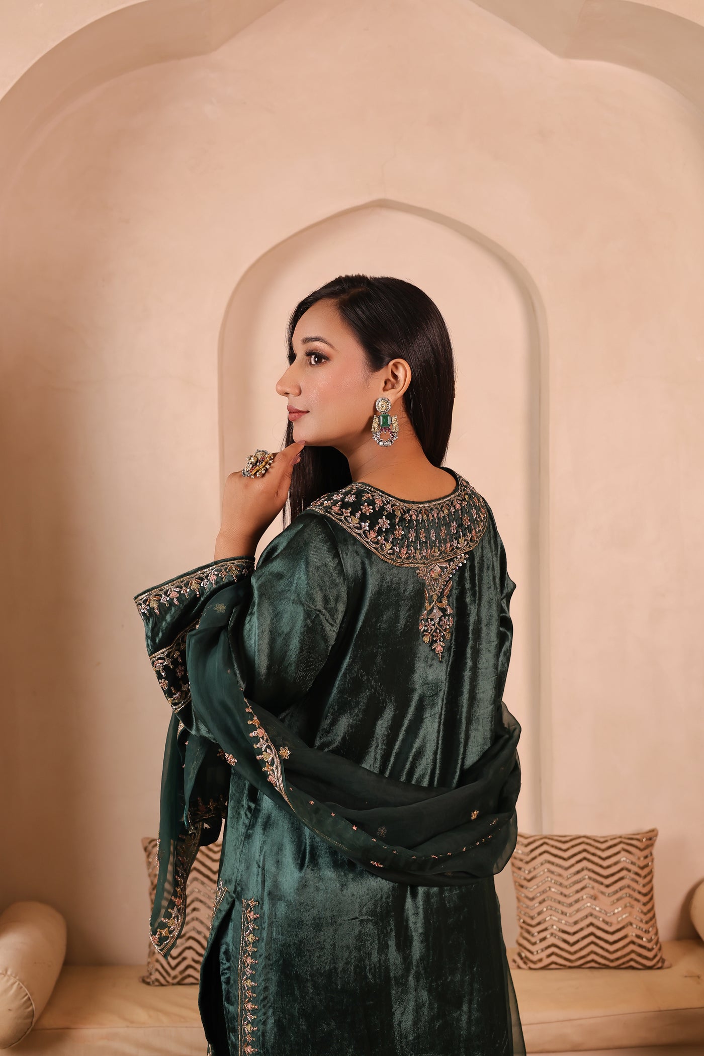 Gulzar Sabz is a handcrafted velvet suit set featuring a kurta paired with izzar palazzo and an organza dupatta. The outfit is detailed with elegant glass beads, dabka, resham, and sequins work, done completely by hand. The rich velvet fabric gives a premium and festive look, making it suitable for weddings, festive occasions, and special gatherings.
