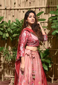 A refreshing take on tradition, Gulaabi Patti is a celebration of cultural craftsmanship with a contemporary spirit. The wrap-around lehenga panel is intricately detailed with delicate gota patti, multi-hued applique, shimmering beads, and resham threads. Its shaded Banarasi yoke blouse adds old-world elegance, while the kota silk dupatta with gota lace finishes the look with a graceful charm. Ideal for the woman who blends heritage with individuality.
