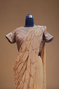 A celebration of sunshine and golden hours, Lehardaar is designed for festive summer weddings and daylit rituals. The saree flows in vibrant waves of georgette, evoking the laughter, joy, and colors of an Indian celebration. Light, radiant, and filled with positive energy, this piece is perfect for bridesmaids, sisters of the bride, or anyone ready to bask in joyful tradition.